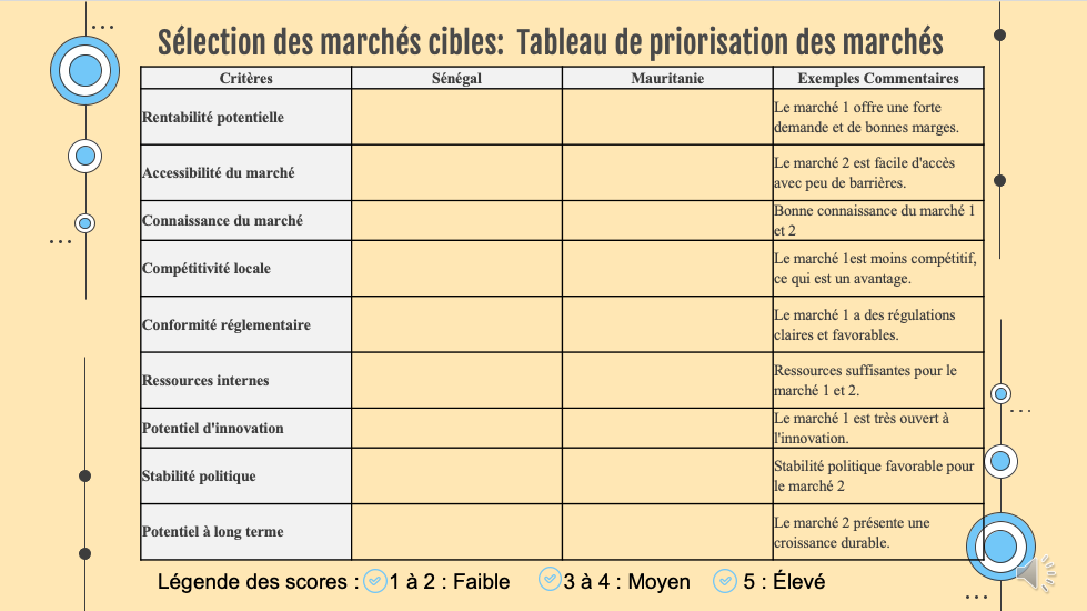 Sélection des marchés cibles : Tableau de priorisation des marchés